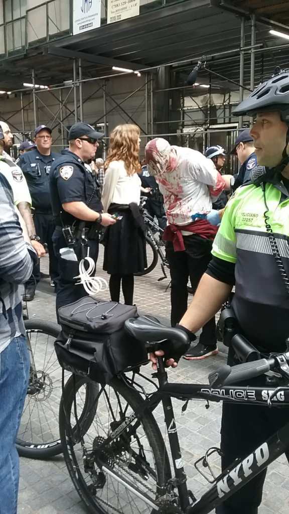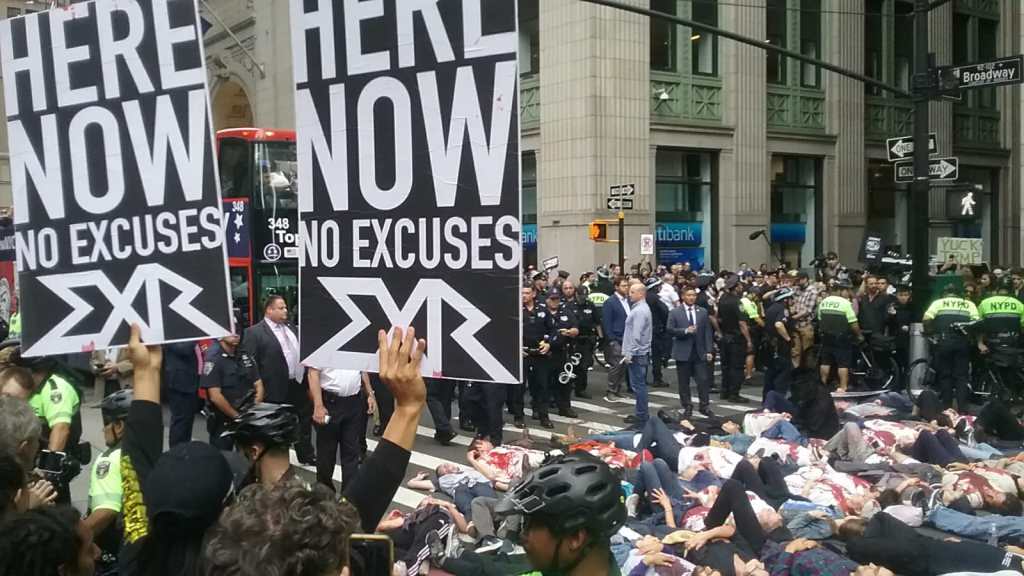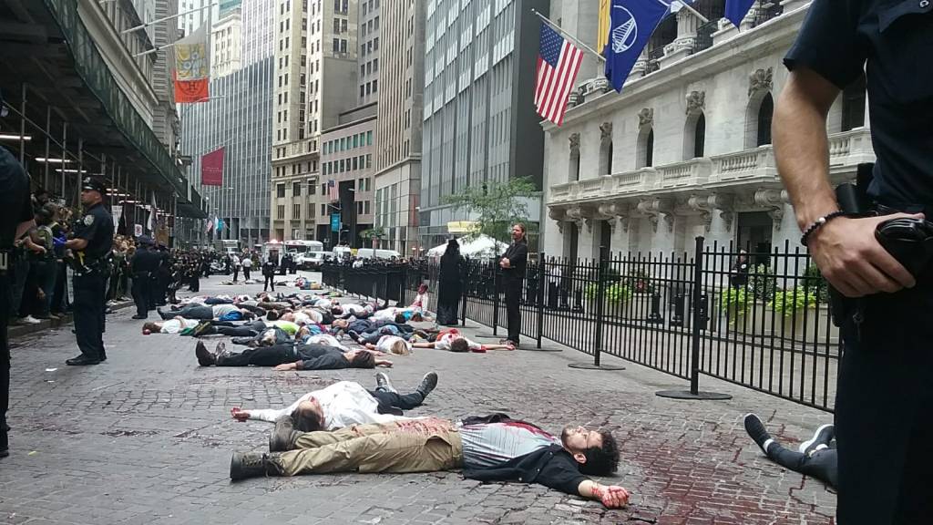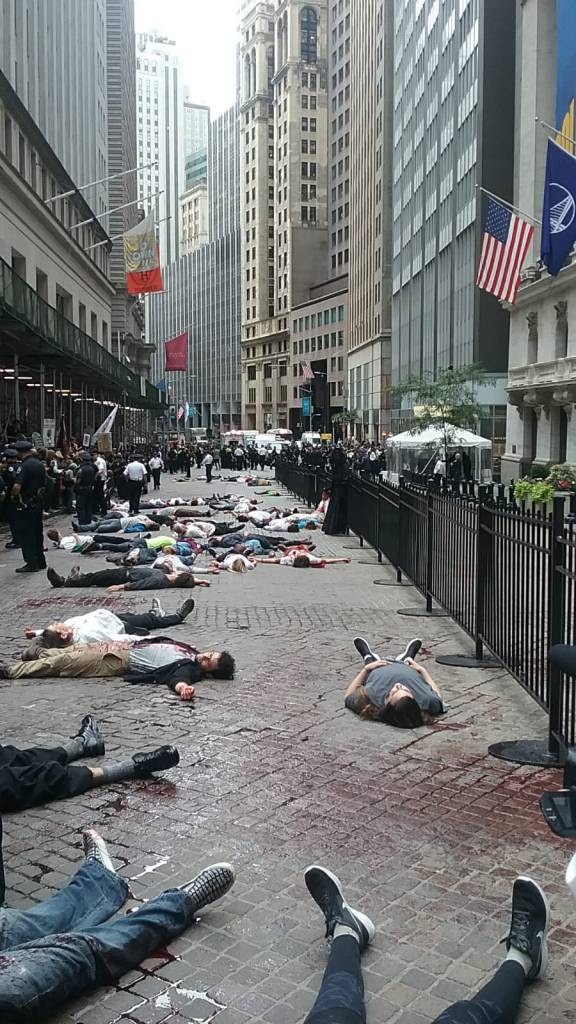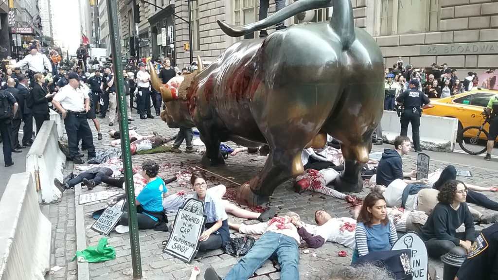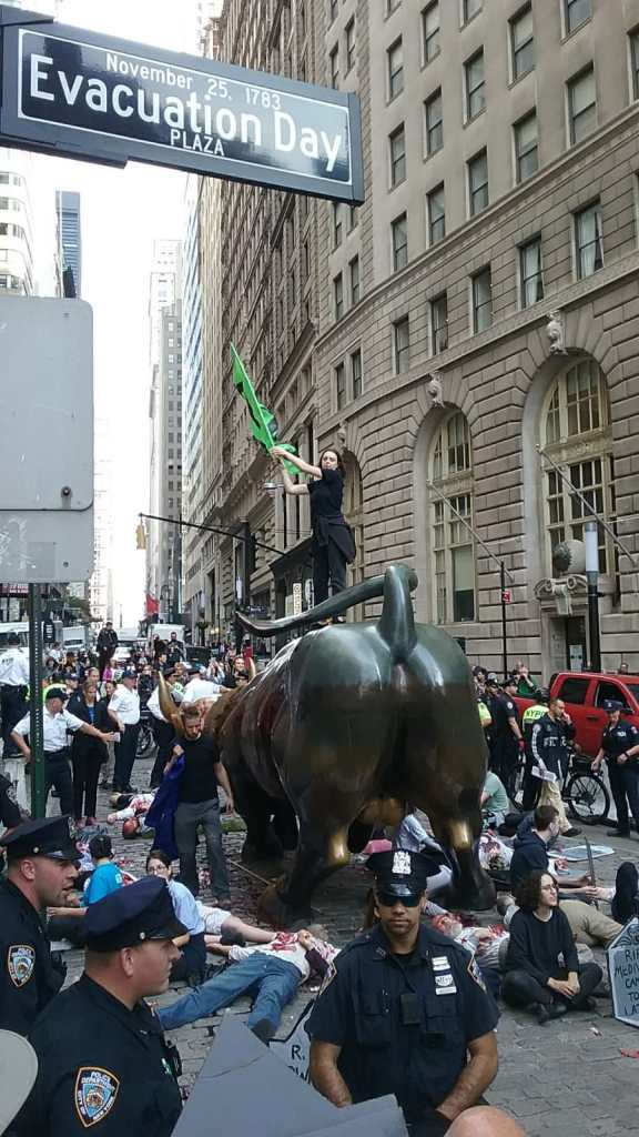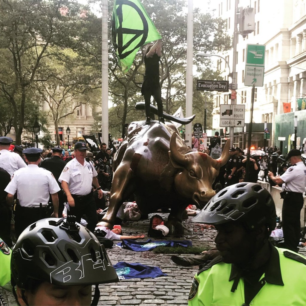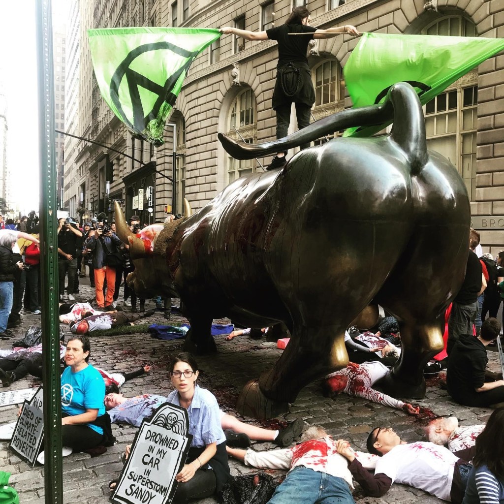 As the march moved north, the first two stops for direct action made a clear connection between the environmental crisis and capitalism. First, the Wall Street Bull — as clear a symbol of American capitalism as can be — was covered in fake blood while activists covered in the same fake blood staged a “die-in” beneath the bull. A woman climbed atop the bull and waved the flag of the movement. Marching further north, activists staged another die-in outside of the stock exchange. According to Noah, a protestor still covered in fake blood that I spoke to after this action, the group chose this spot to draw attention to the fact that “capital is guilty in the climate crisis.” The group then moved on and blocked the intersection of Pine Street and Broadway Avenue, with roughly 50 members of the group lying down in front of a double decker tourist bus, clogging up traffic for the better part of an hour.