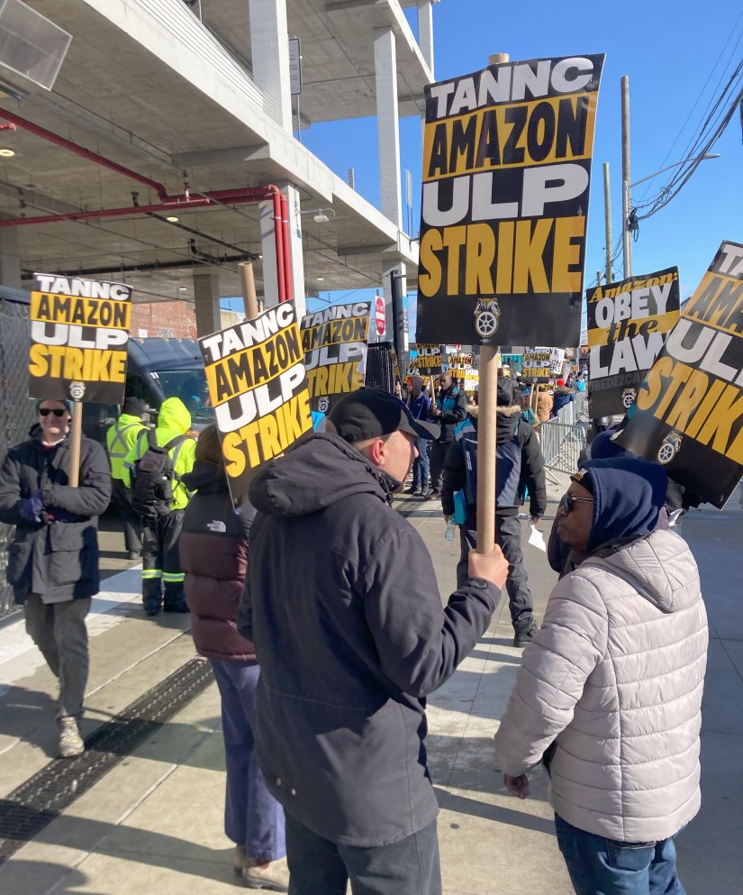 The picket line we visited in Queens, NY, on a very cold Saturday morning, was lively and well attended. Other sites went out in Georgia and Illinois, five in California, and on Saturday morning workers at the JFK8 facility in Staten Island joined the strike. The Teamsters are calling this the largest strike at Amazon ever, and claim “The Teamsters Union represents nearly 10,000 Amazon workers at 10 warehouses and delivery stations.” This includes the 5,500 at Staten Island’s JFK8, the only facility to have won a union election. This is still only about 1% of Amazon’s hourly workforce, and none of the eventual nine facilities affected were shut down by the strikes. But, despite Amazon’s claims, deliveries were delayed and the coordinated event should be seen as a milestone, and an important step for continued organization.