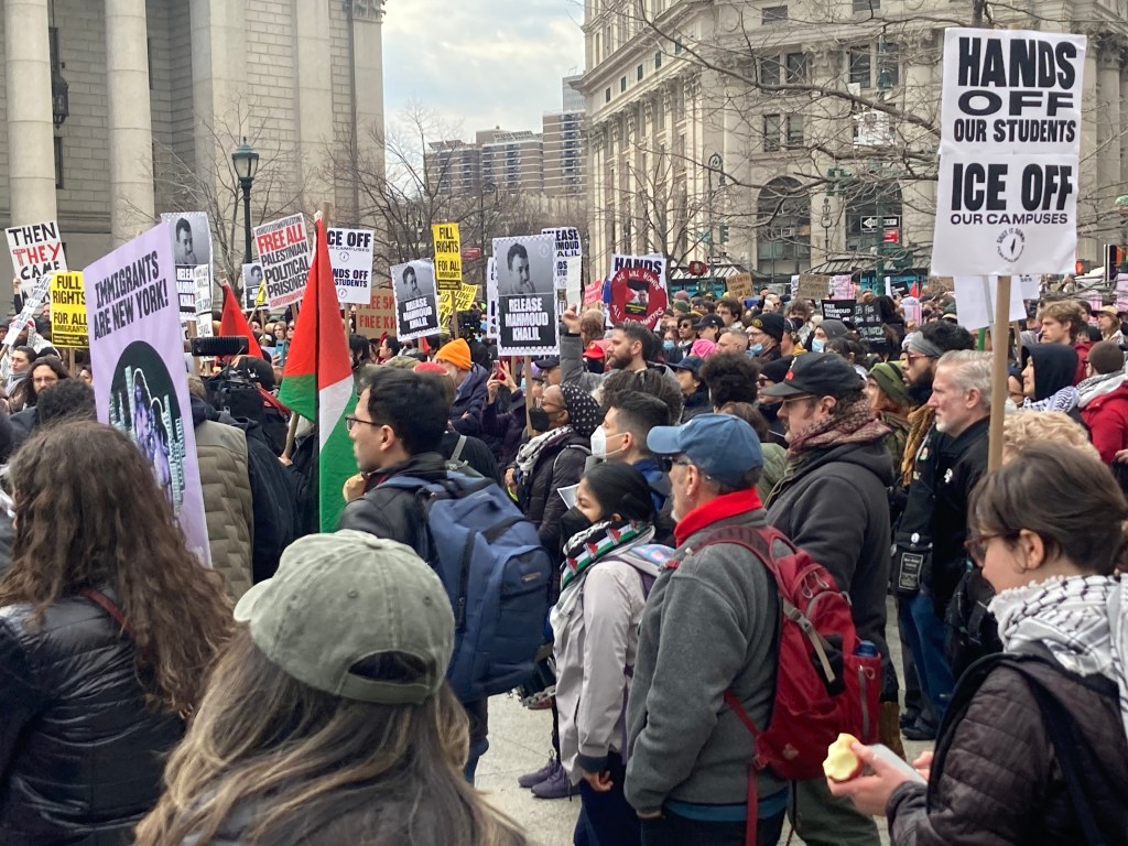 That afternoon NYU students joined Students for Justice for Palestine chapters from several colleges for a rally in Washington Square Park. A professor with NYU Faculty and Staff for Justice in Palestine said the arrest was blatantly illegal, “If the Trump administration for one second is allowed to get away with it, then there’s really nothing that can stop the officers of the state from doing anything with any of us.”