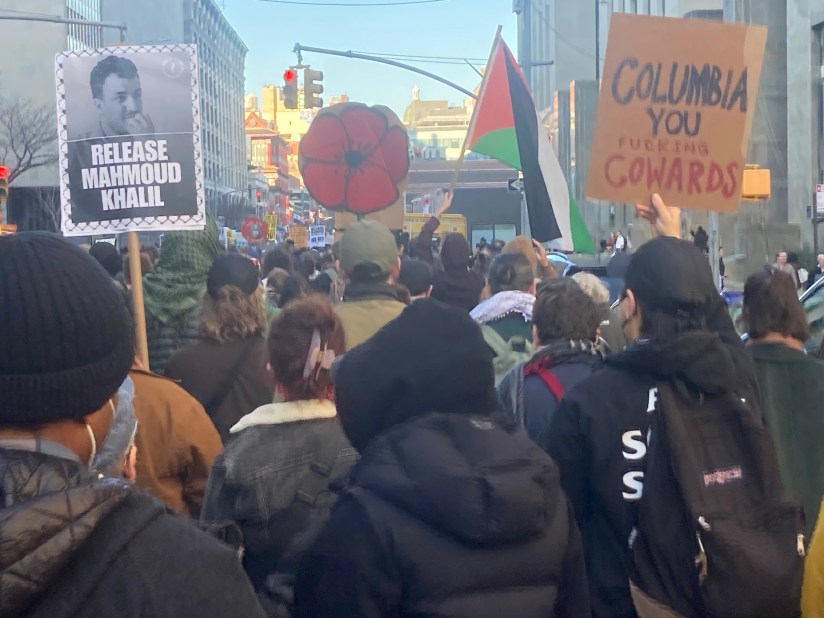 Monday, March 10 saw large crowds in New York’s Foley Square. Organized largely by Shut It Down for Palestine, there were also speakers from Jewish Voice for Peace and different immigration, civil liberties, and socialist groups, and campus unions. Around 2,000 marched, blocking rush-hour traffic, up to Union Square. On the same Monday, many Barnard and Columbia faculty spoke outside Columbia’s School of the Arts building in support of Khalil.