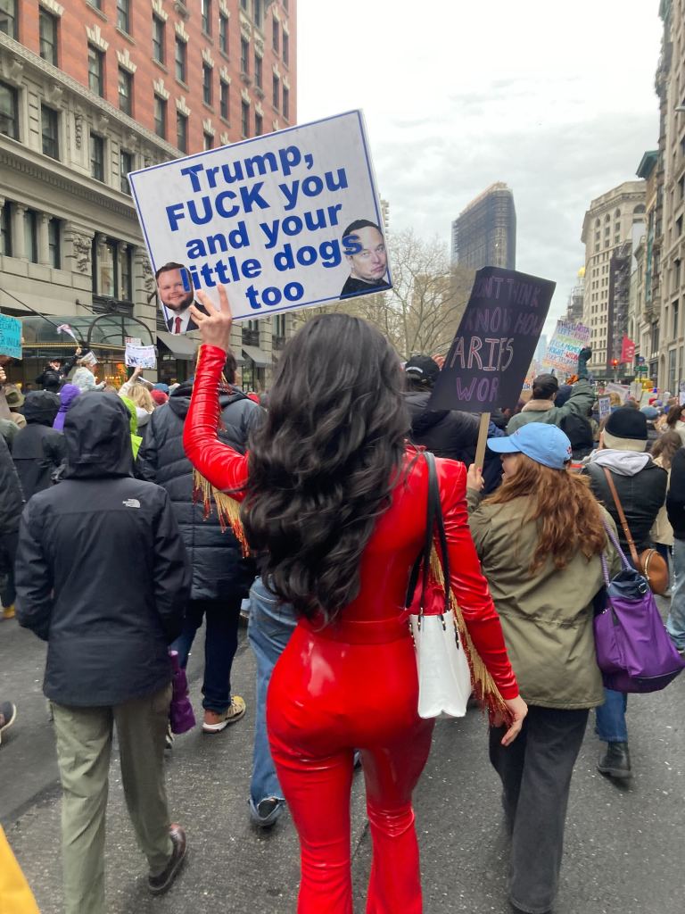 Although it didn’t have the energy of the pro-Palestinian demonstrations where constant chants would erupt and get picked up by everyone, people did chant “Hey Hey, Ho Ho, Elon Musk has got to go,” and other favorites. Eric, a socialist on the march with his son, reported that when he introduced “What Do We Do? Stand Up Fight Back!” chants about immigrants, trans kids, civil rights and union rights, they all were repeated loudly. Almost all the signs were handmade and they expressed clearly where people were at: “Stop The Billionaire Takeover,” “Deport Elon,” “Keep Your Creepy Hands Off Our Bodies.” And the general themes of: “Hands off Our Schools/ Medicaid/ Medicare/ Social Security!”
