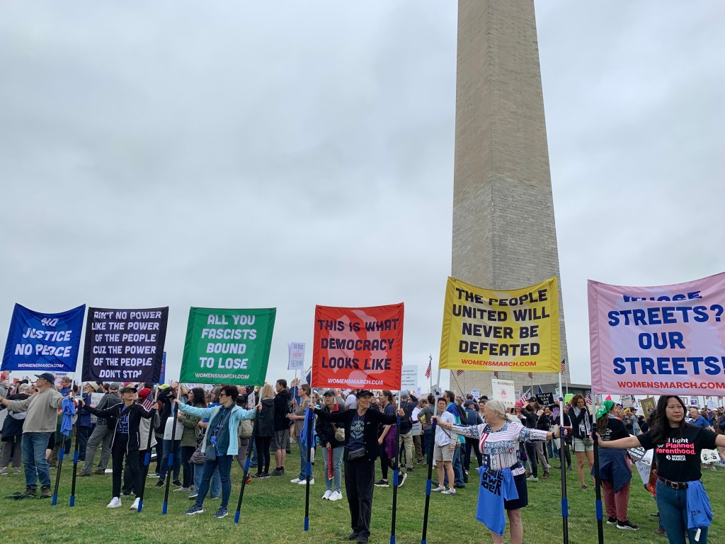 The Women’s March, which had sparked the immense marches against Trump at the start of his first term, but seen smaller numbers so far, was part of mobilizing for the DC rally, and brought colorful banners on a range of issues.