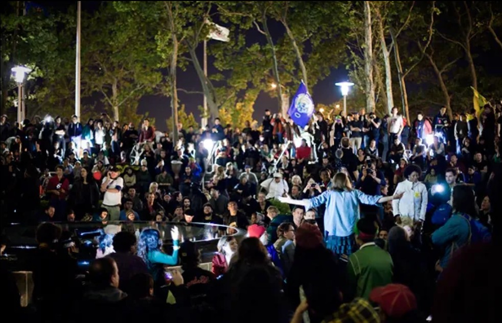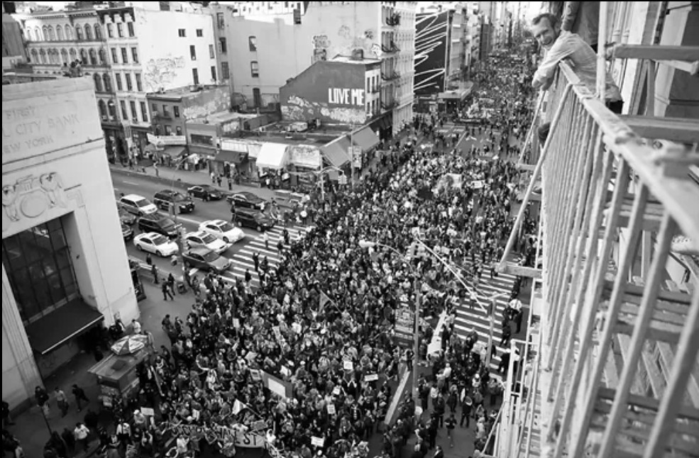 Again, in 2012, on the May Day after Occupy Wall Street was evicted from Zuccotti Park in New York City, 50,000–100,000 marchers went down Broadway, fueled by major trade unions. The prestige of Occupy helped bring together sections of the left that normally marched separately, and more who never marched on May Day before. Unions gathered in Union Square, where a concert included Tom Morello. Then immigrant, environmental, socialist and anarchist groups mingled with Occupy and major union contingents.