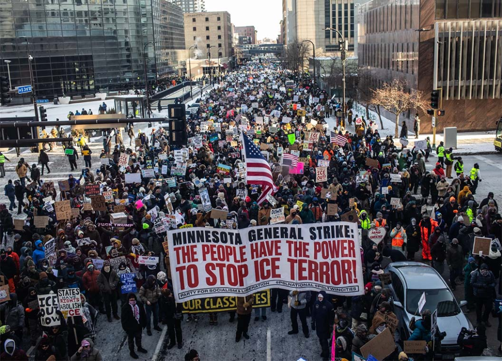 En Minneapolis, la gente se negó a ir al trabajo, a la escuela o de compras, en una muestra de rabia contra las acciones del “Servicio de Inmigración y Control de Aduanas”, es decir, el ICE, la milicia racista de Donald Trump. Hasta 100.000 personas se manifestaron al mediodía por el centro de la ciudad, a pesar del frío ártico.