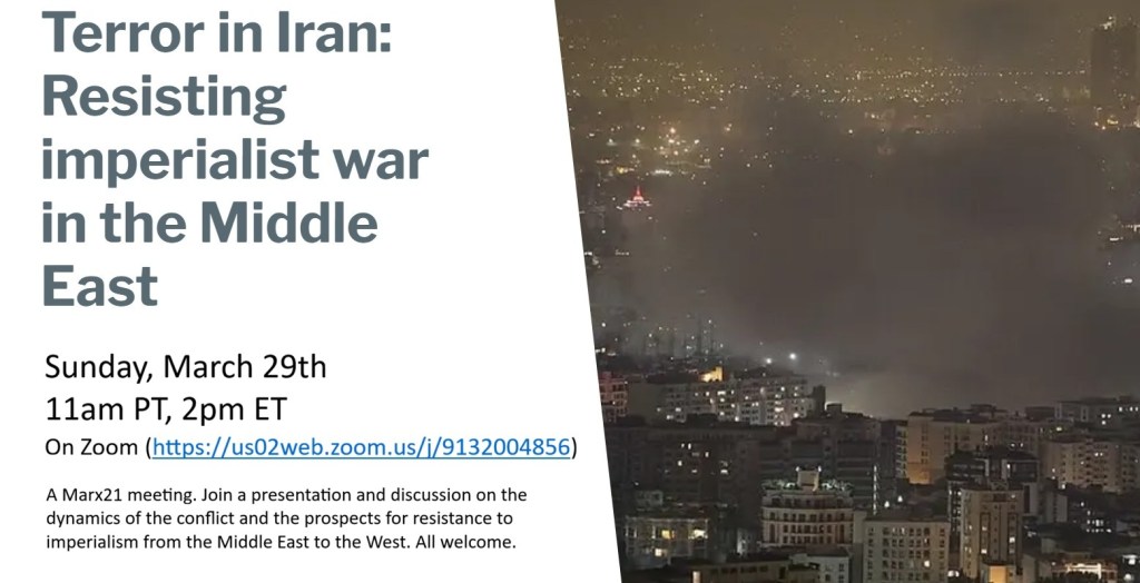 Join a presentation and discussion on the dynamics of the conflict and the prospects for resistance to imperialism from the Middle East to the West. This Sunday, March 29, 11am Pacific and 2pm Eastern time. Marx21 Zoom: https://us02web.zoom.us/j/9132004856